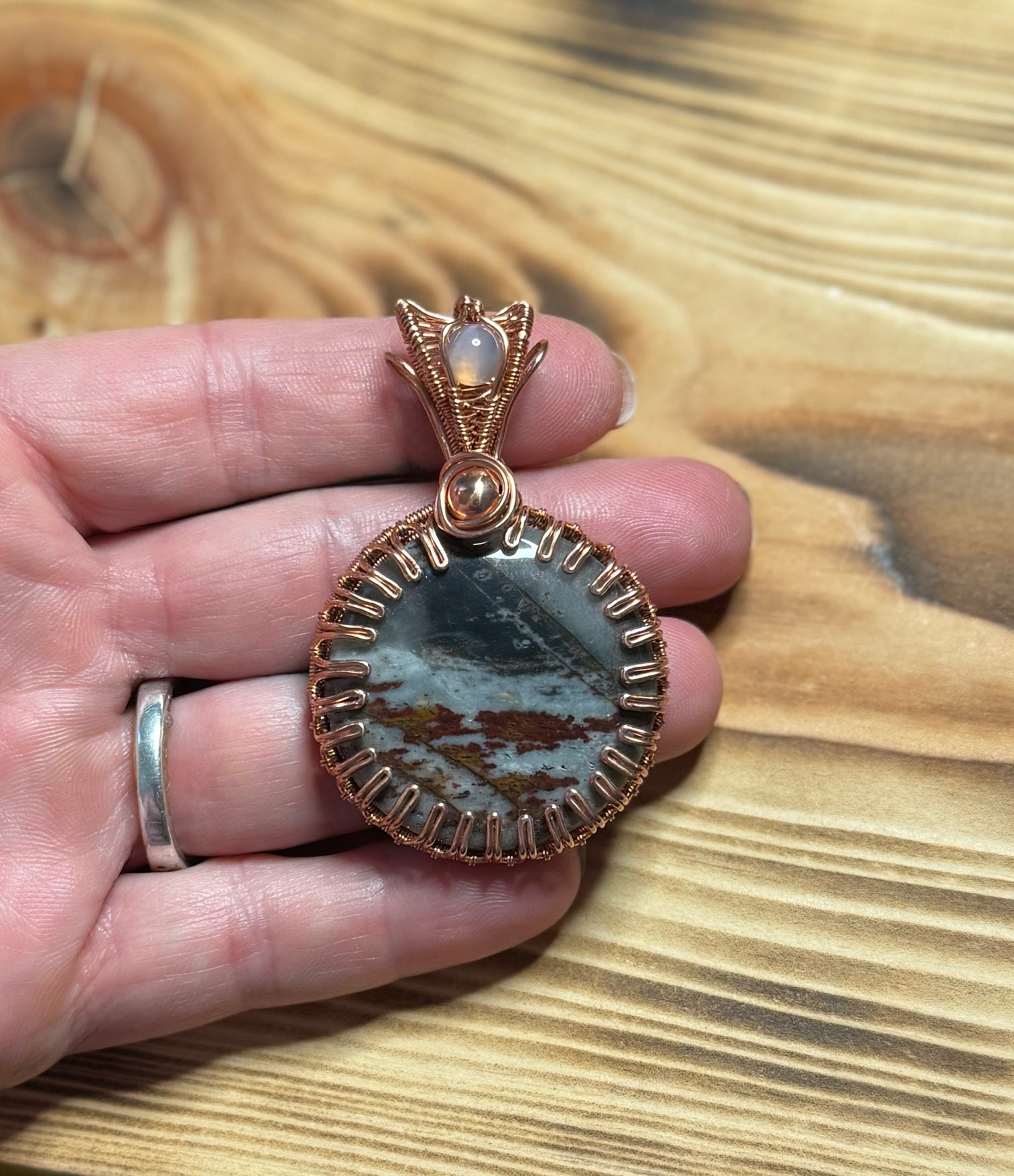 This pendant pairs creamy, earthy Coconut Jasper with the deep, grounding tones of Smoky Quartz, all hand-wrapped in warm copper. Each piece is unique, blending natural elegance with grounding energy, perfect for adding a subtle yet striking touch to your everyday style.