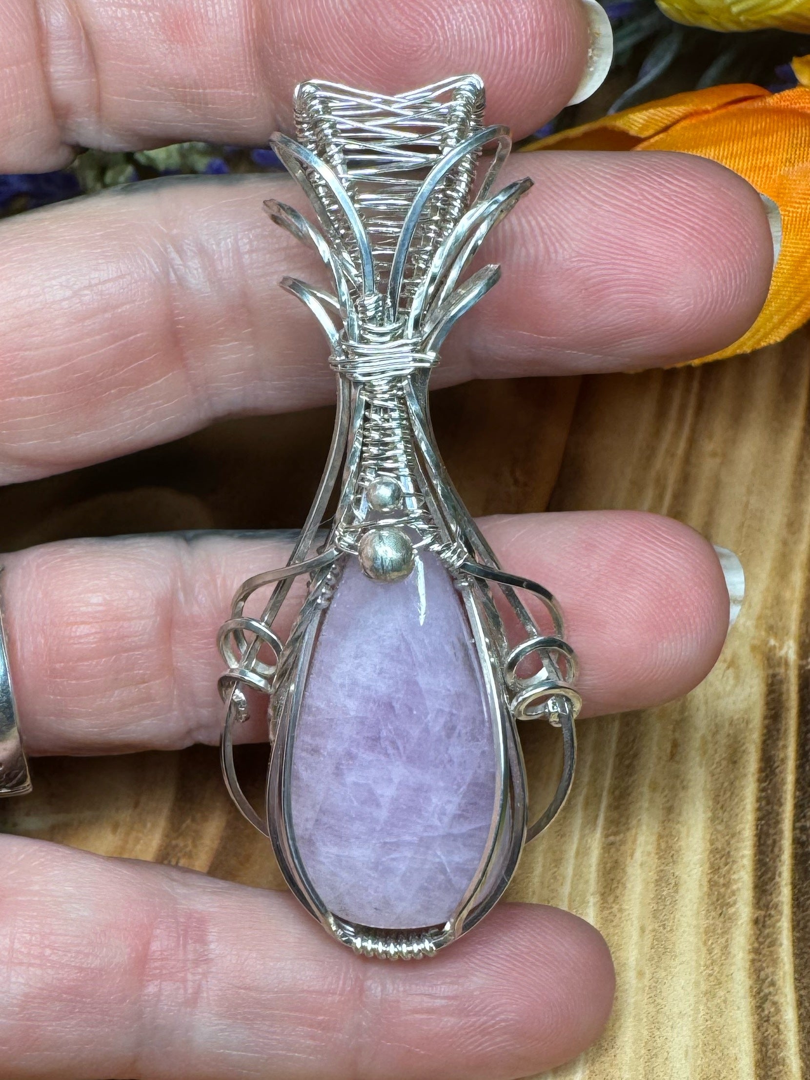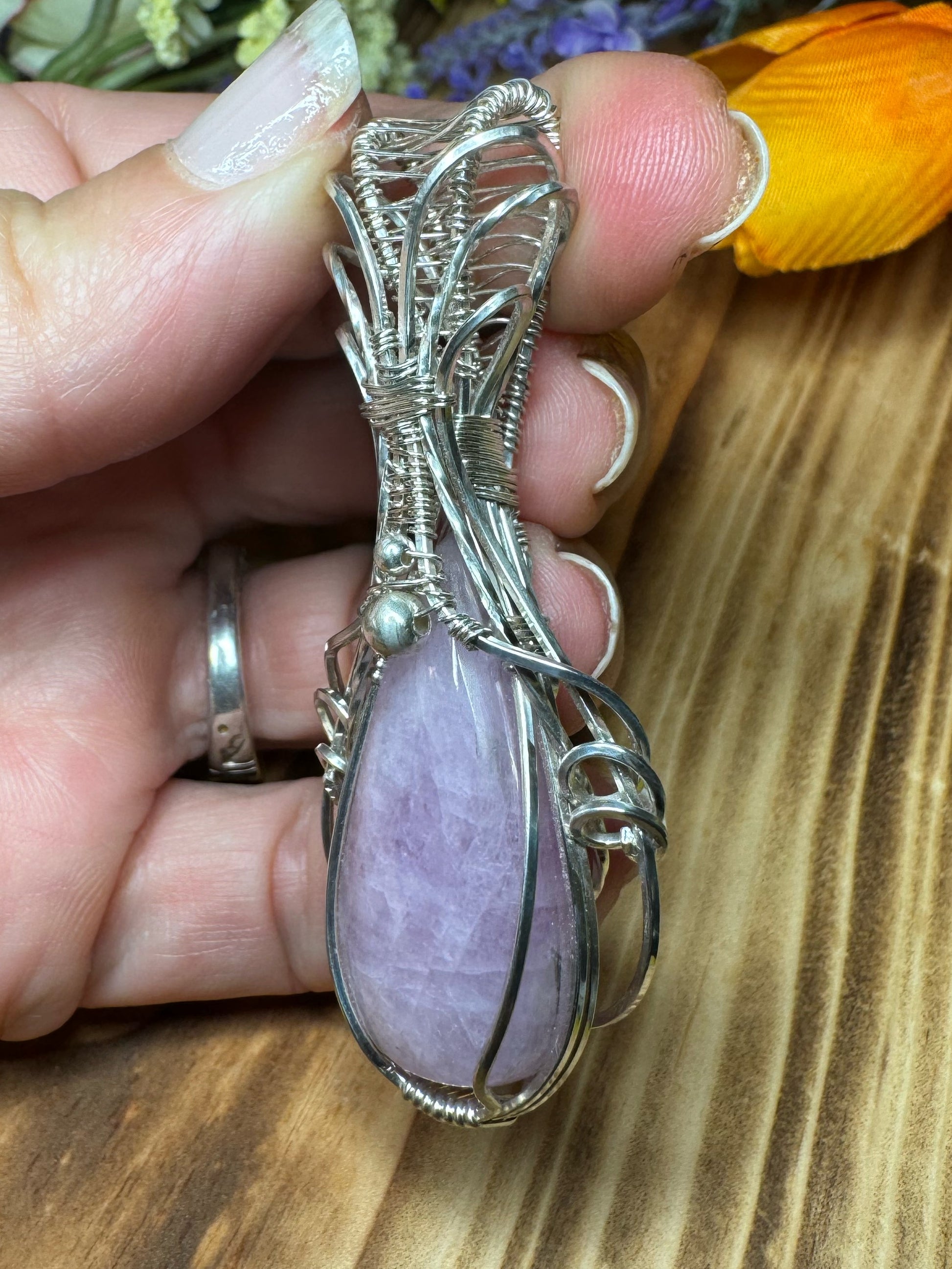 A delicate kunzite pendant wrapped in sterling silver, showcasing soft pastel hues and a gentle, luminous glow. The cool silver setting highlights the stone’s natural elegance, creating a calming and feminine piece perfect for everyday wear or special occasions.