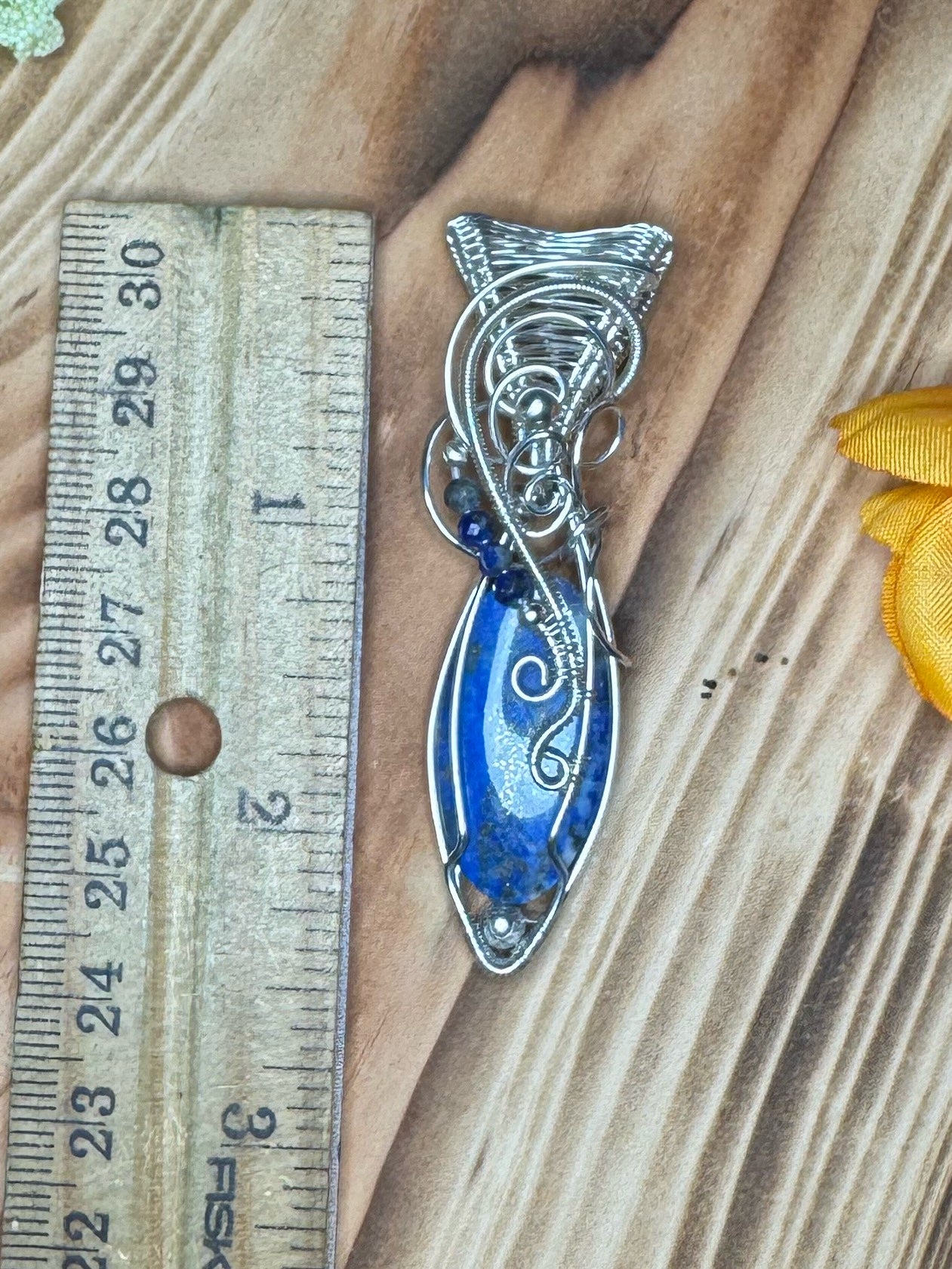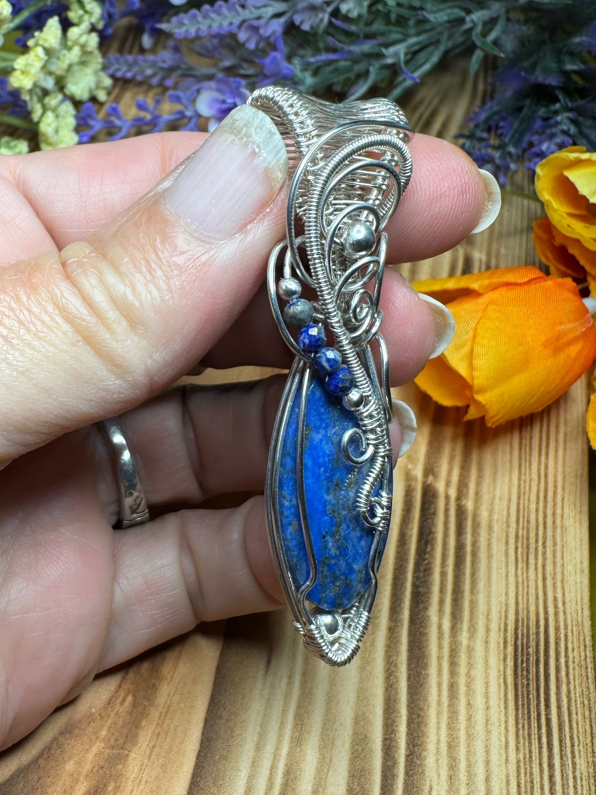 This elegant sterling silver pendant showcases a deep blue lapis lazuli stone, wrapped to highlight its natural gold flecks and rich color. The sleek silver setting adds a refined, timeless touch, making it a perfect statement piece for any collection.