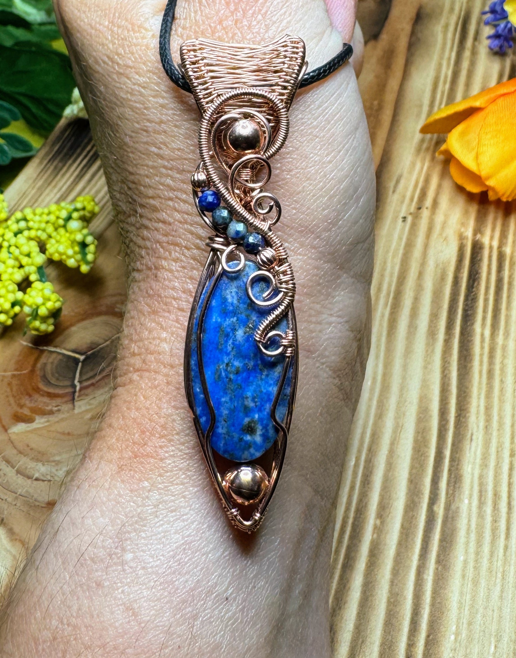 This handcrafted pendant features deep blue Lapis Lazuli wrapped in warm bare copper, creating a timeless, earthy contrast. Its rich golden flecks and organic wirework make it a bold, elegant statement piece for everyday wear or special occasions.