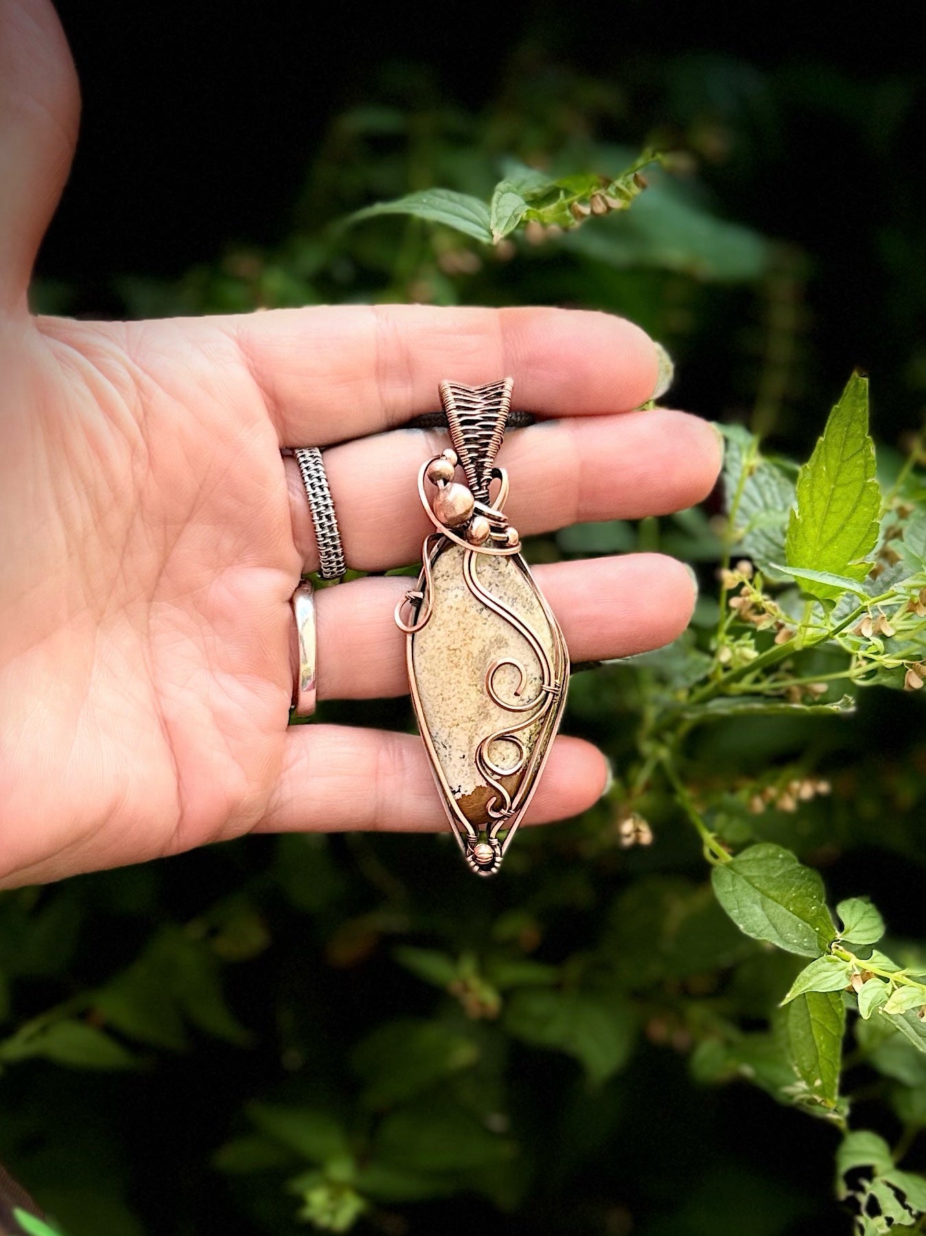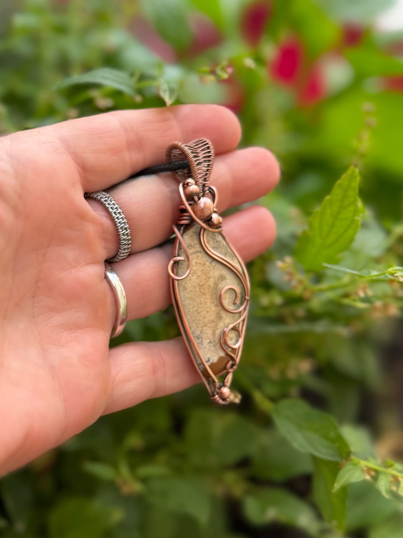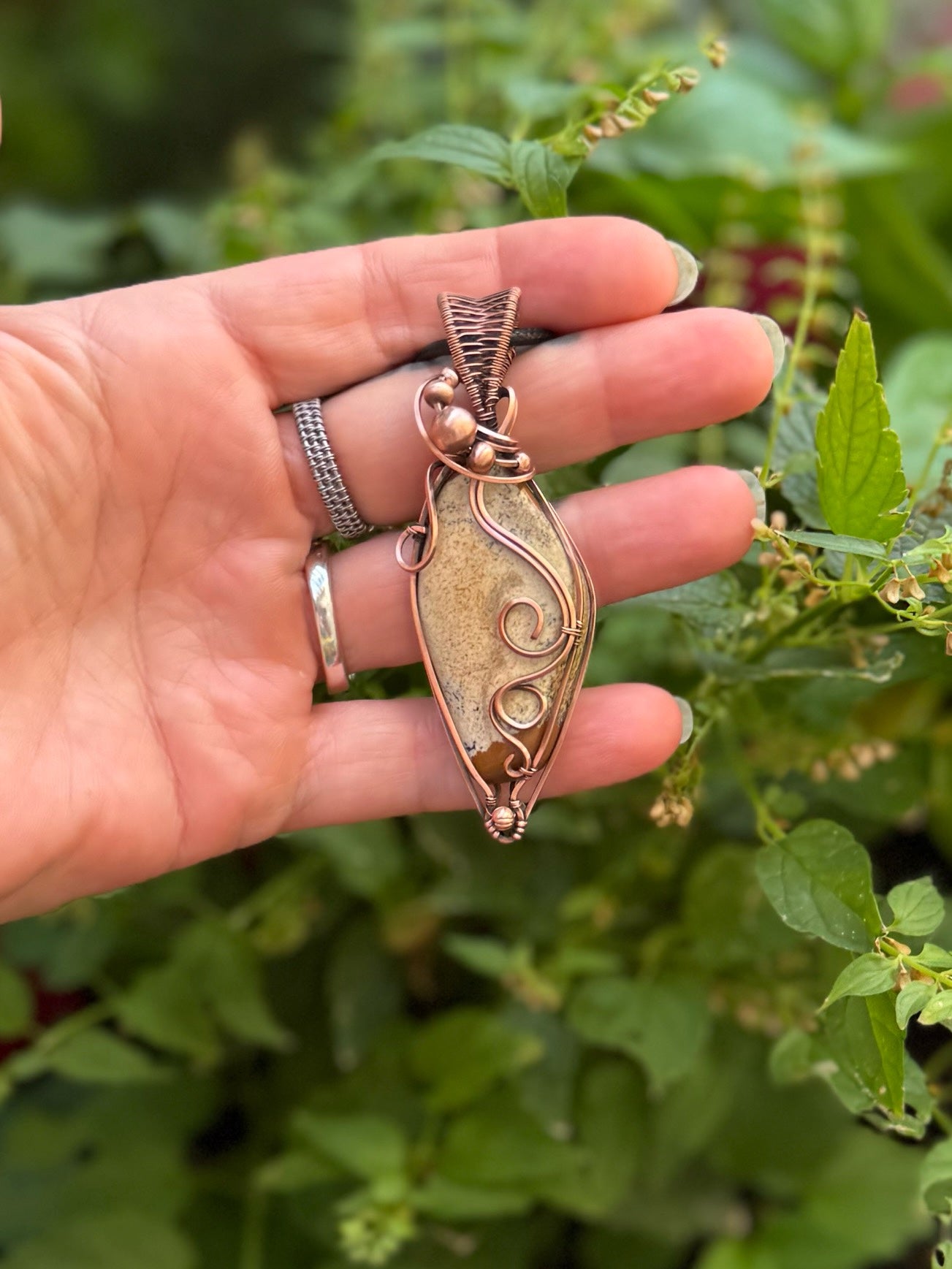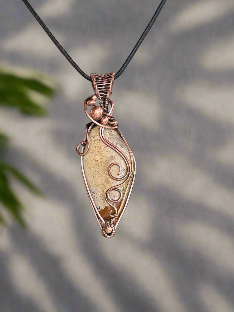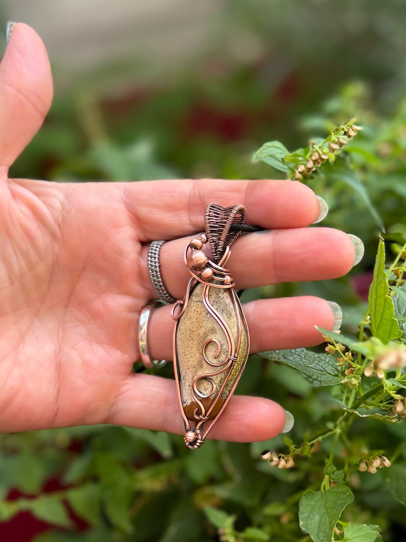 This Picture Jasper pendant, wrapped in warm copper, showcases nature’s artistry in every line and hue. Its earthy browns, tans, and creams resemble desert landscapes and canyon horizons, making it a wearable piece of natural art. The handcrafted copper setting enhances its organic tones, giving it a timeless, earthy elegance.