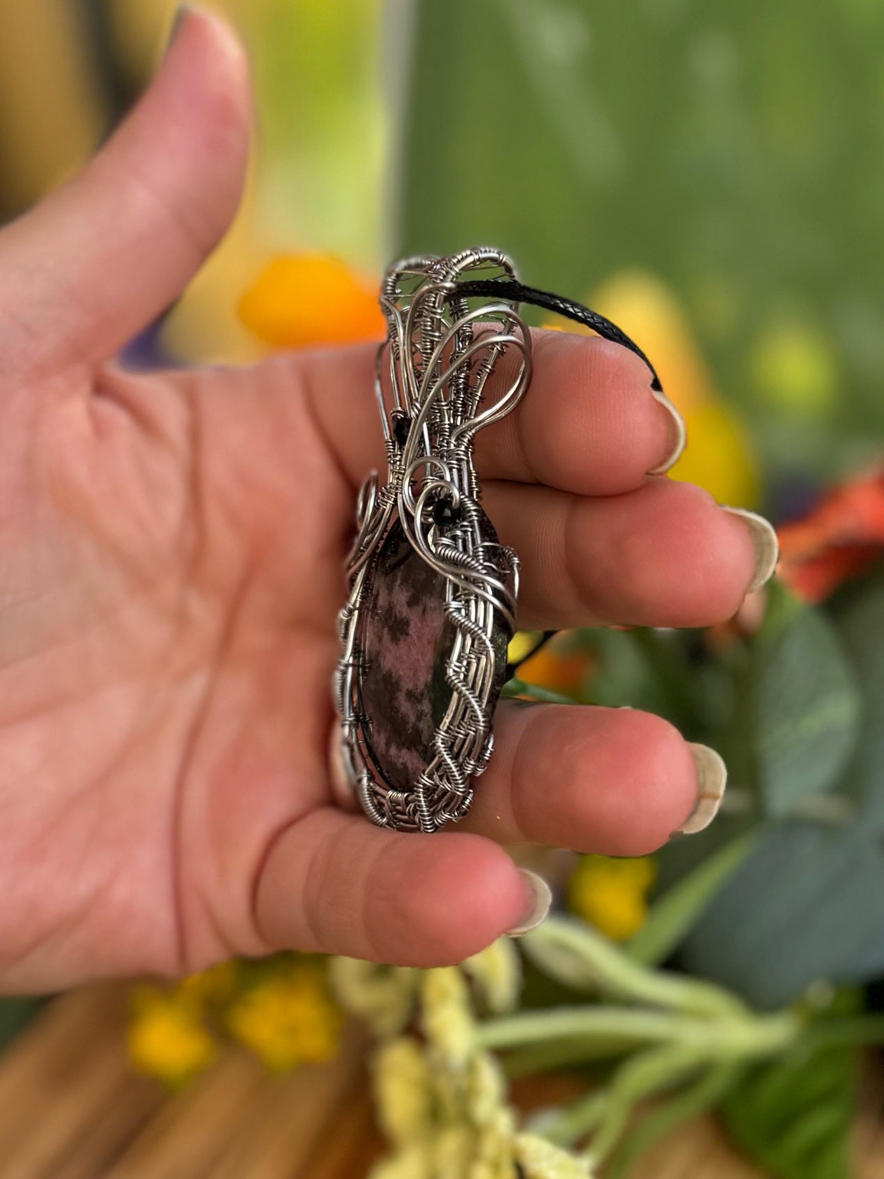This pendant combines vibrant pink Rhodonite with deep black Agate, set in sleek stainless steel. The contrasting colors create a bold, contemporary look, while the polished stainless steel adds modern durability and elegance. Each piece showcases the unique patterns of Rhodonite, making it one-of-a-kind.