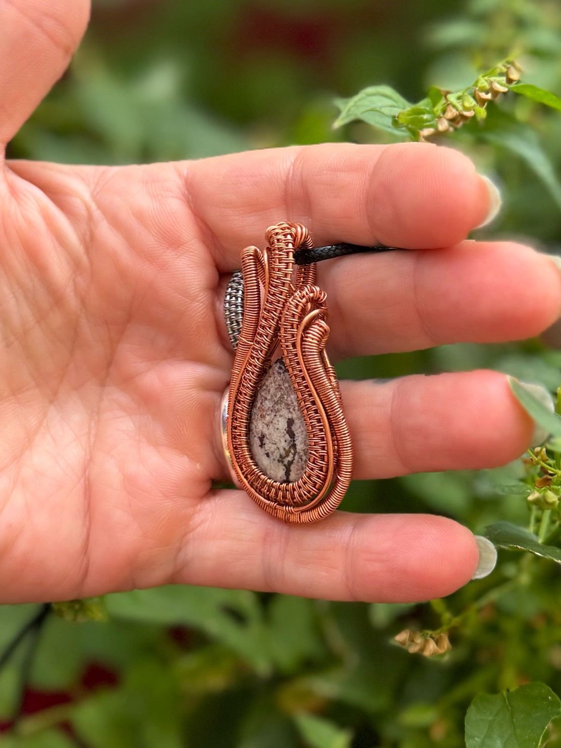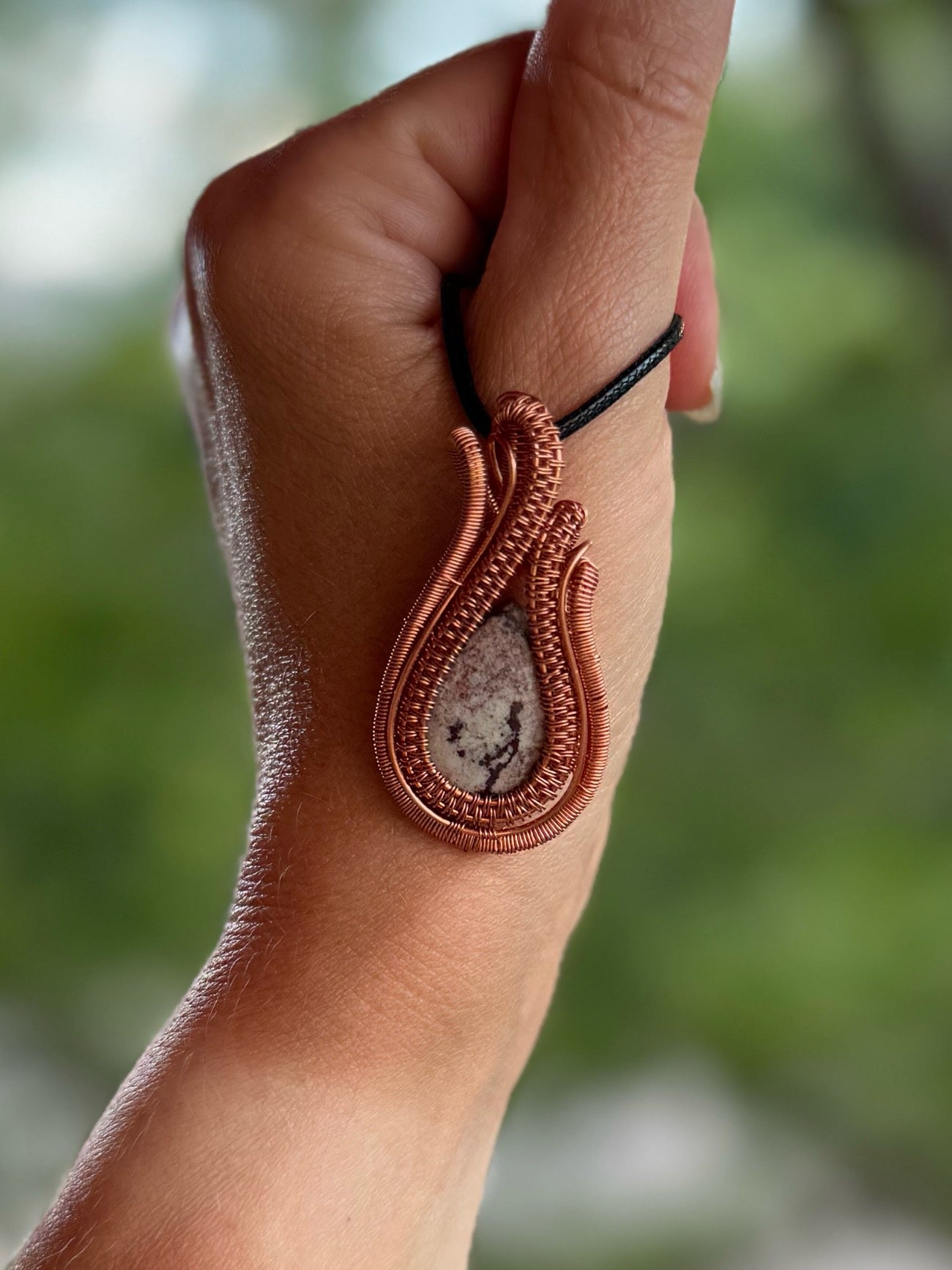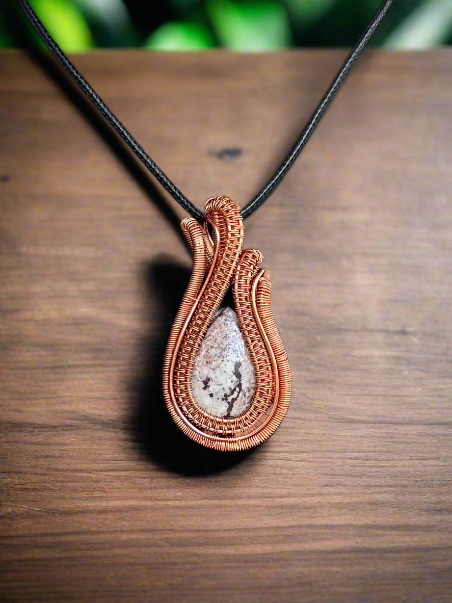 This Sonora Rhyolite pendant, wrapped in warm copper, captures the rugged beauty of desert landscapes. Its earthy white, browns, and pinks blend like painted stone, each swirl telling a story of ancient volcanic origins. The handcrafted copper setting enhances its natural warmth and organic texture, creating a grounded yet artistic statement piece.