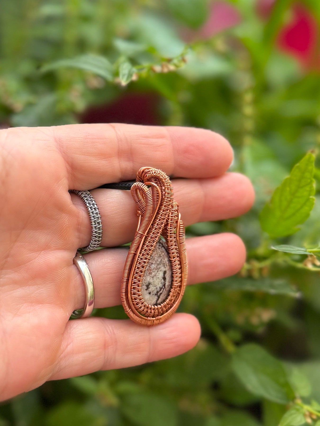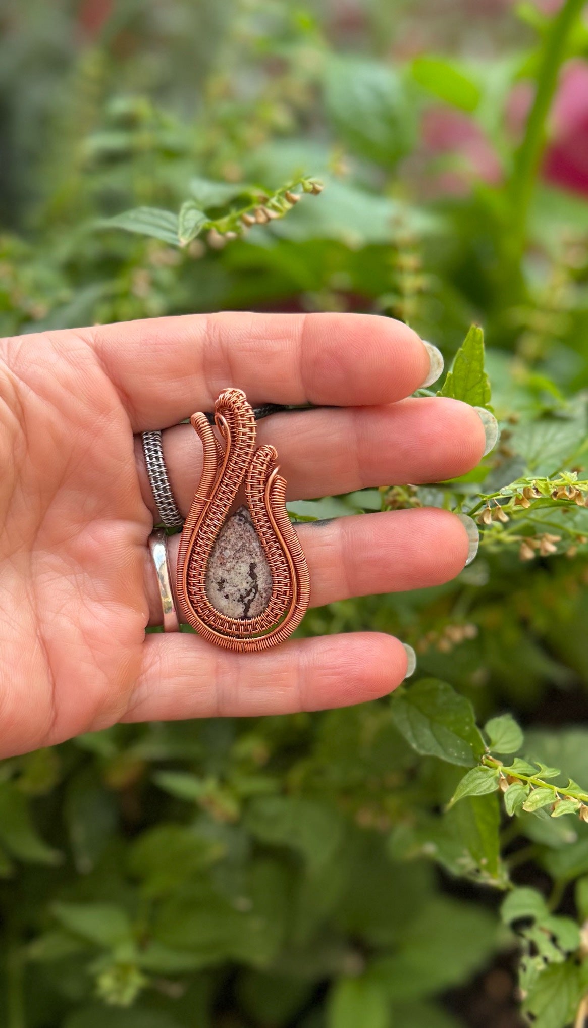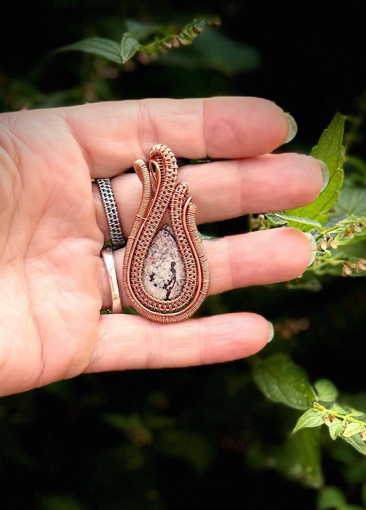 This Sonora Rhyolite pendant, wrapped in warm copper, captures the rugged beauty of desert landscapes. Its earthy white, browns, and pinks blend like painted stone, each swirl telling a story of ancient volcanic origins. The handcrafted copper setting enhances its natural warmth and organic texture, creating a grounded yet artistic statement piece.