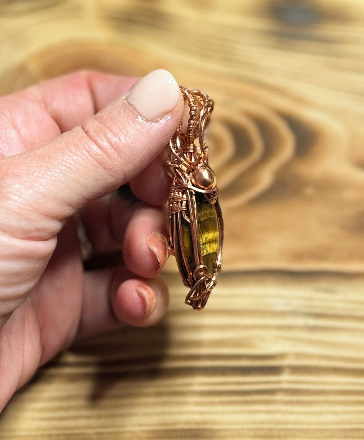 A warm, earthy pendant showcasing a polished Tiger’s Eye wrapped in rich copper wire. The stone’s natural chatoyance catches the light beautifully, creating a timeless piece with depth, movement, and grounding energy.